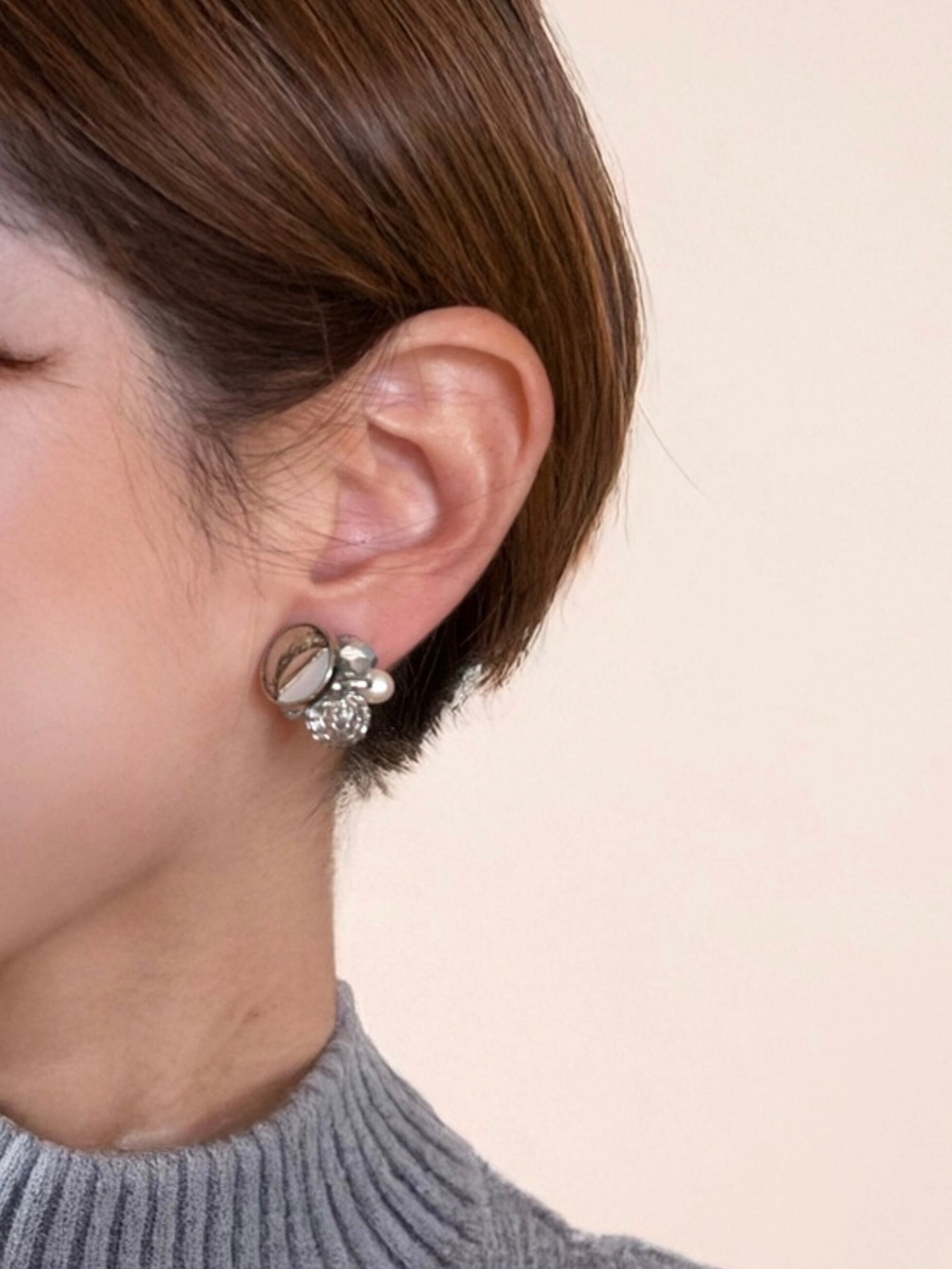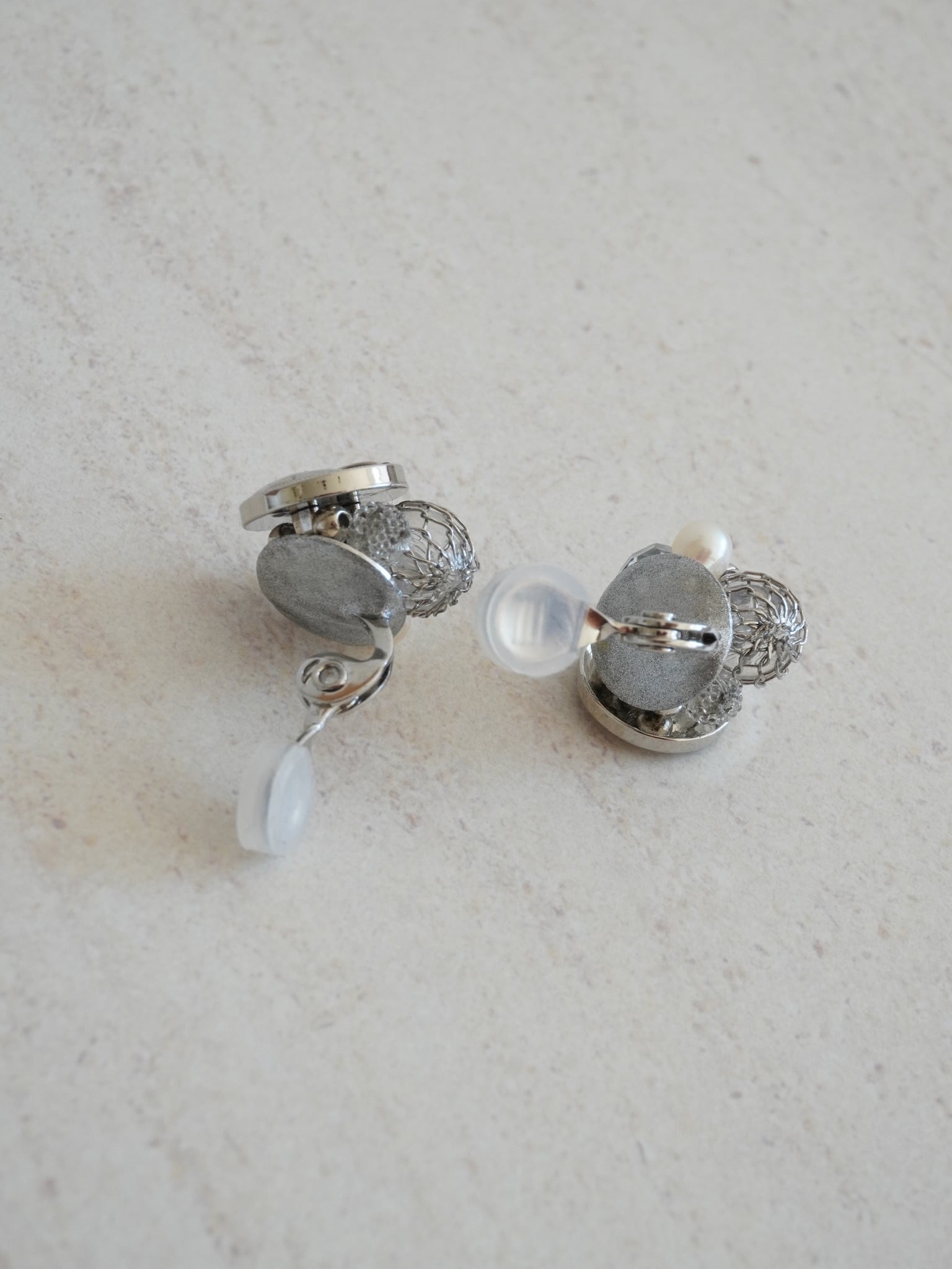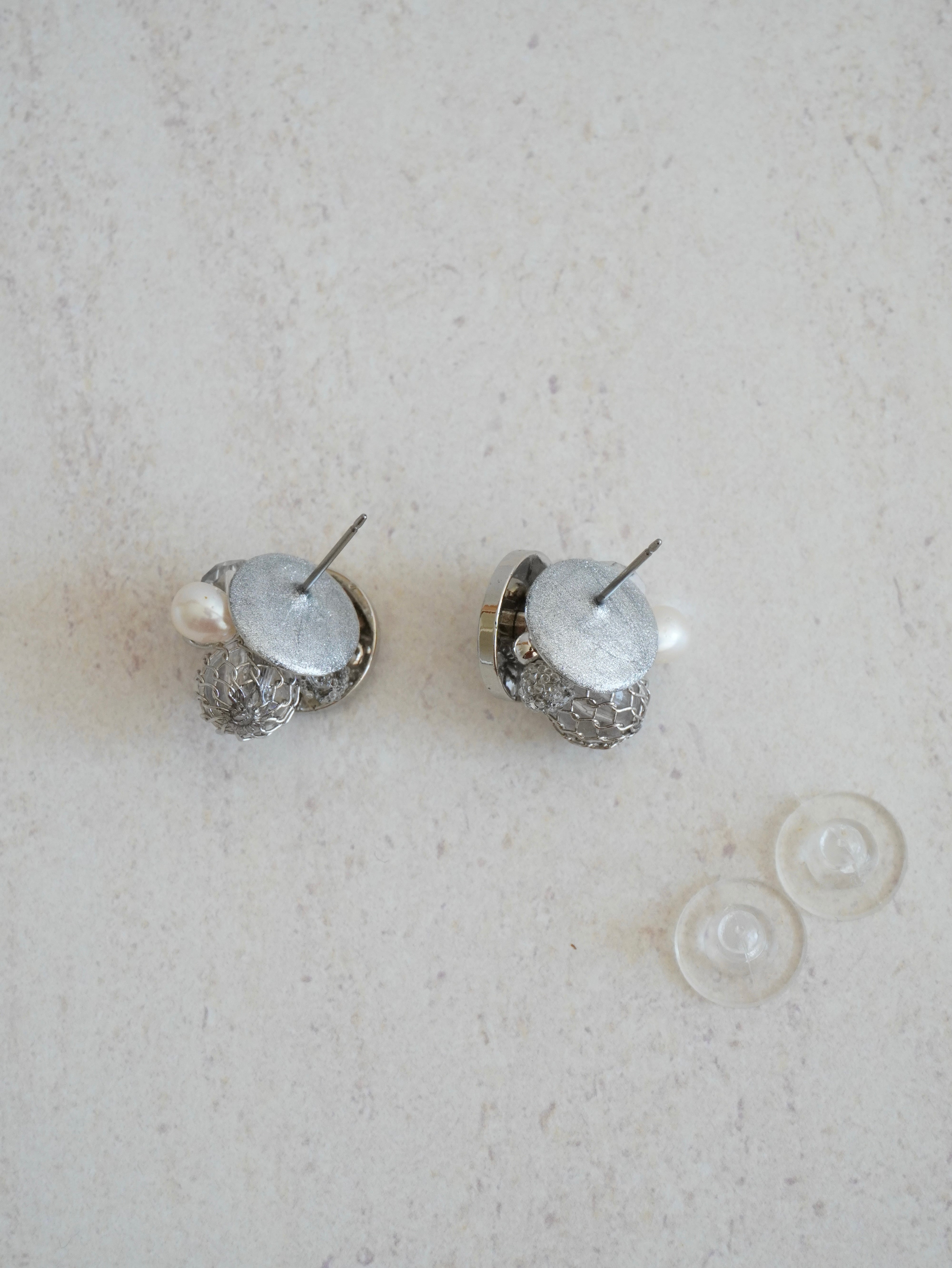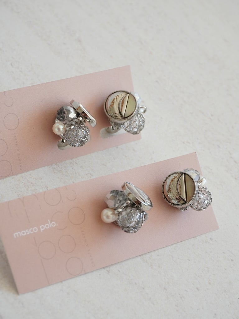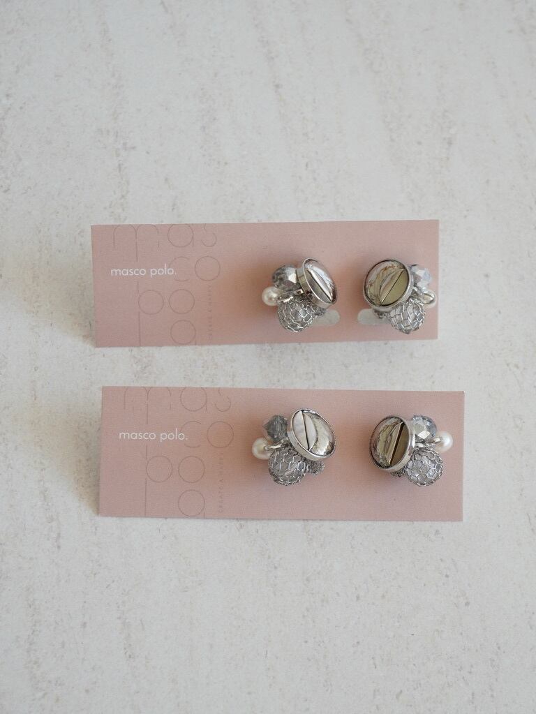 めくれたようなデザインが面白いボタンとメタリックなビーズを編み込みました