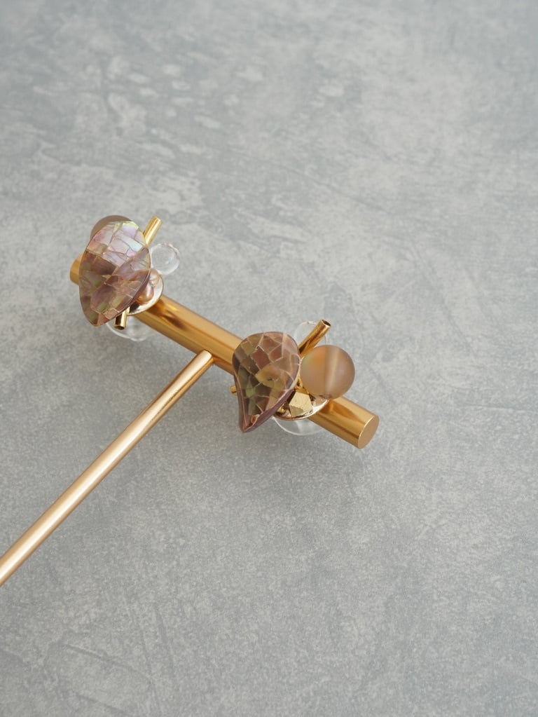 湾曲した形が面白く、ビーズやメタルパーツなどを合わせて編み込みました