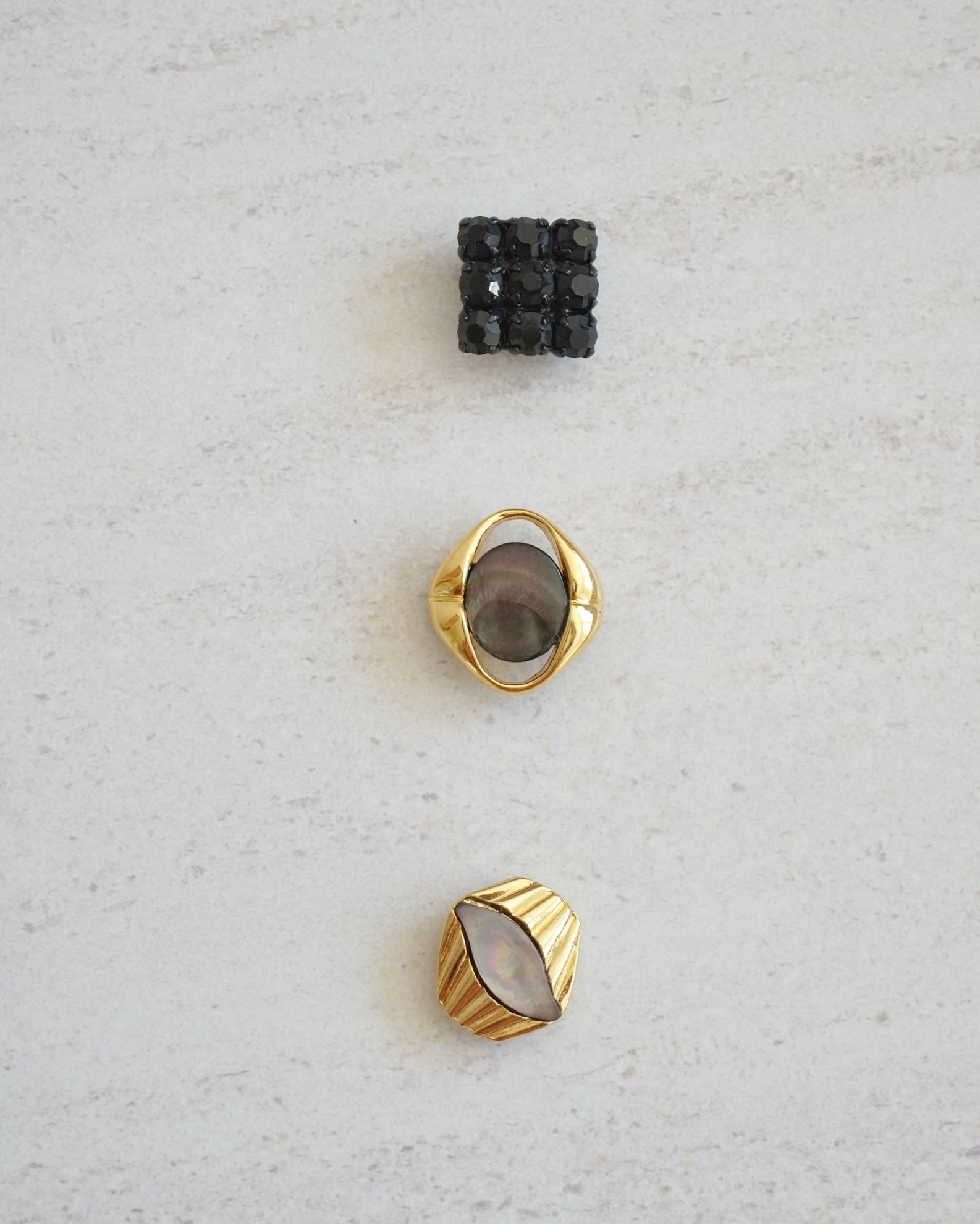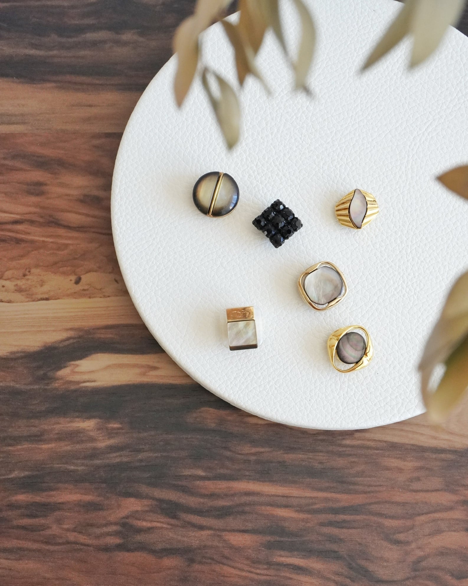 真ん中:ゴールドのフレームと黒蝶貝が美しい抜け感のあるデザイン