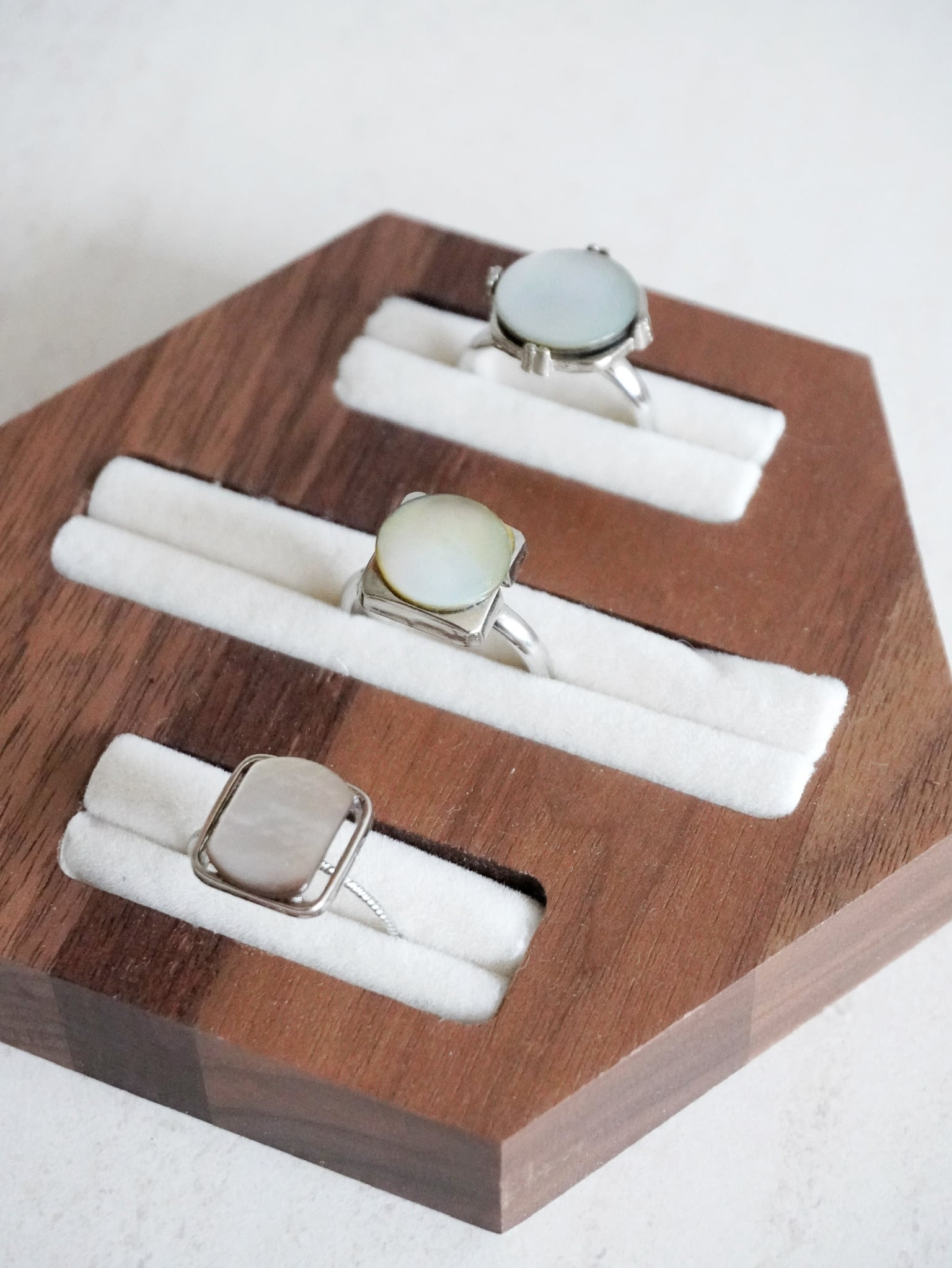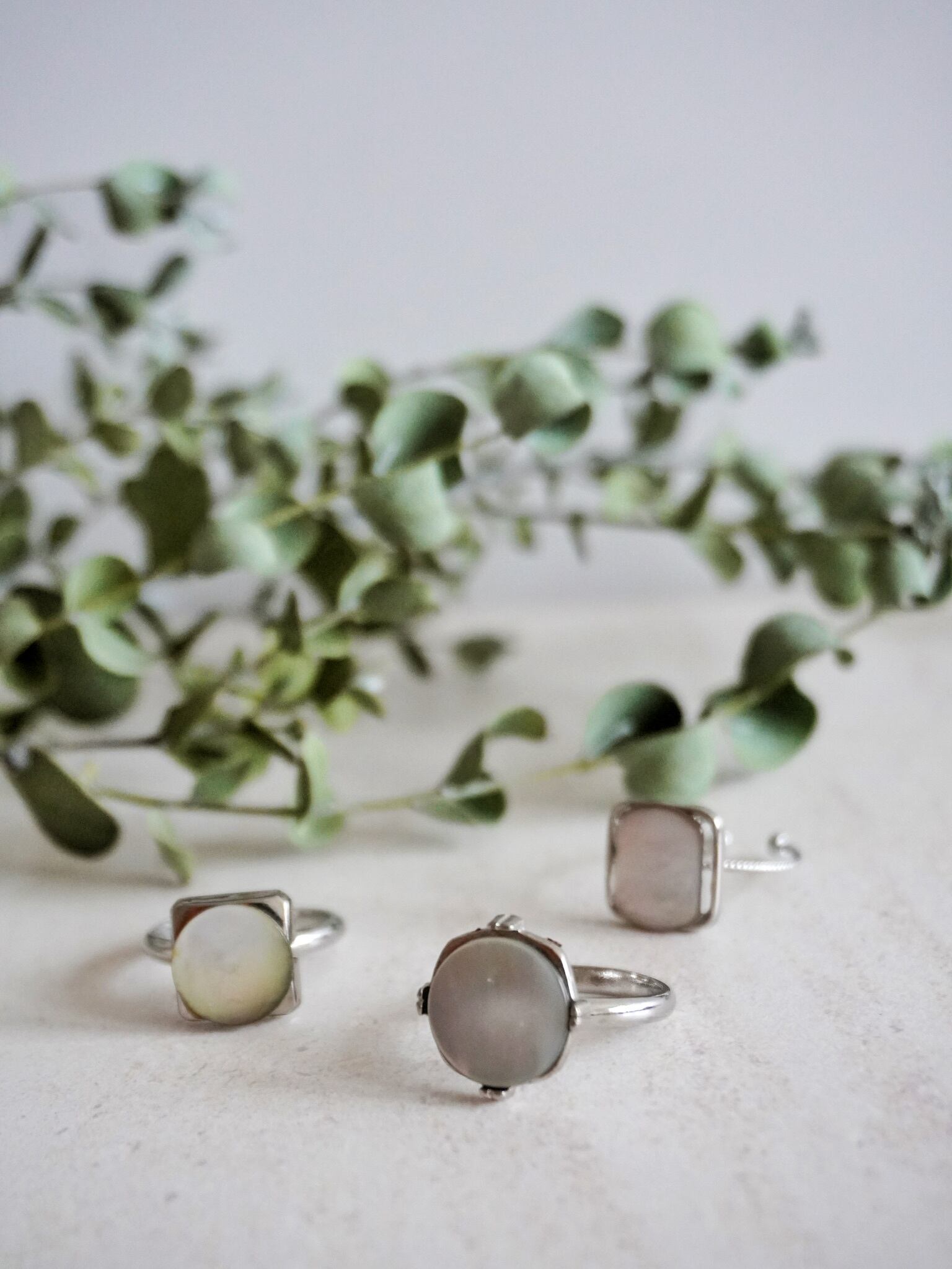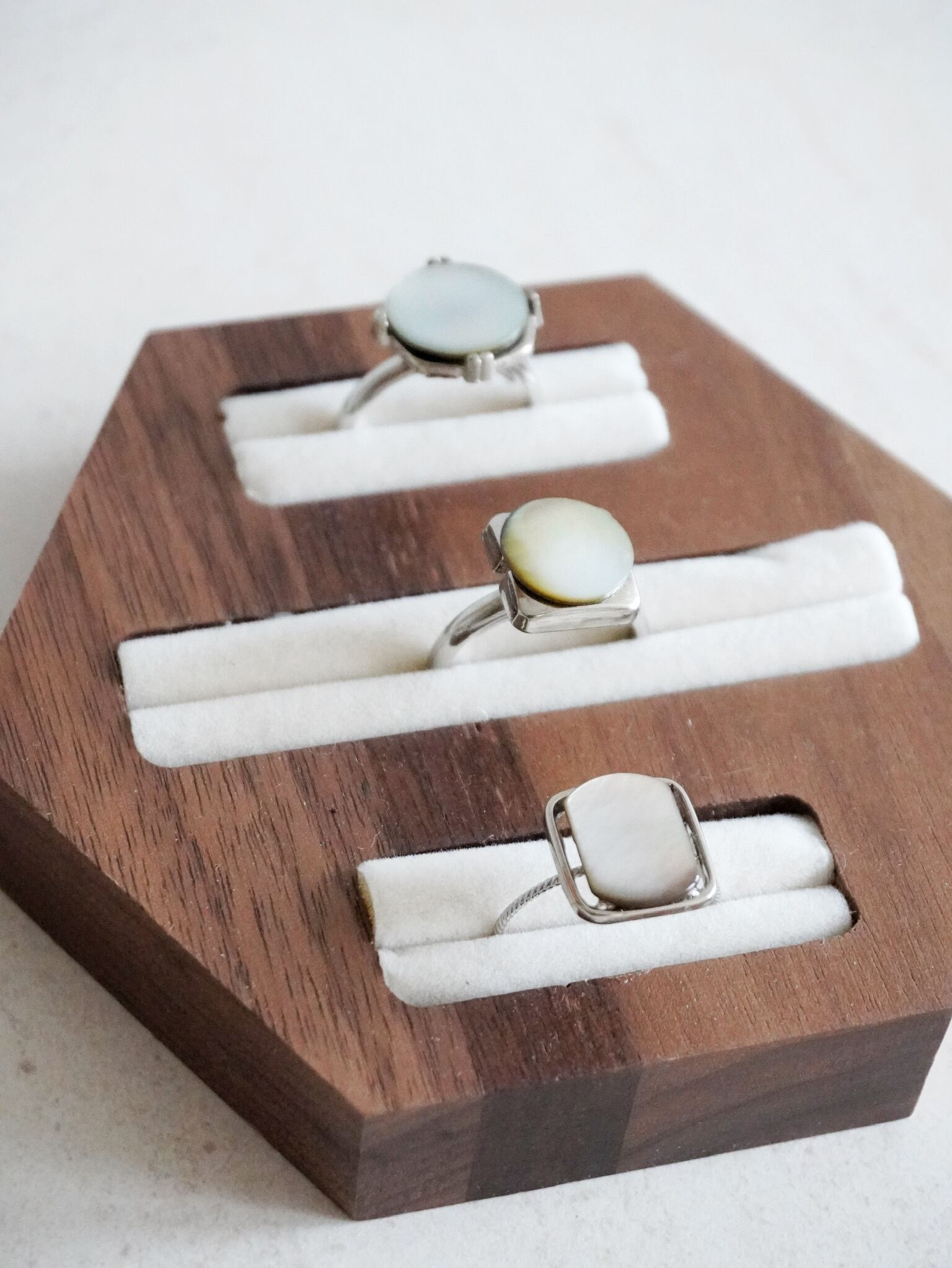 真ん中:厚みのある貝の丸と、メタルの四角が幾何学的なデザイン