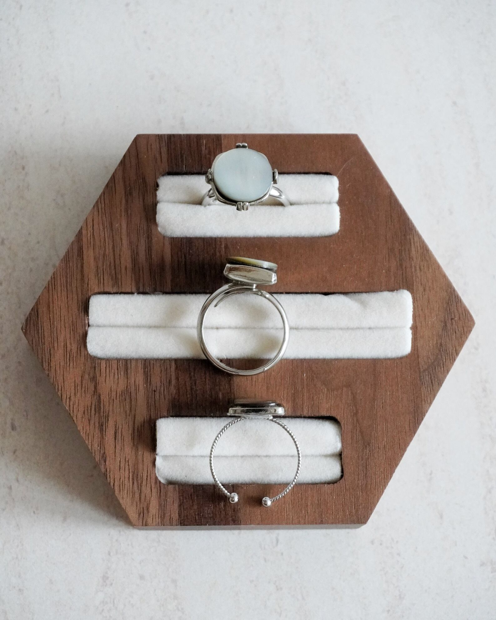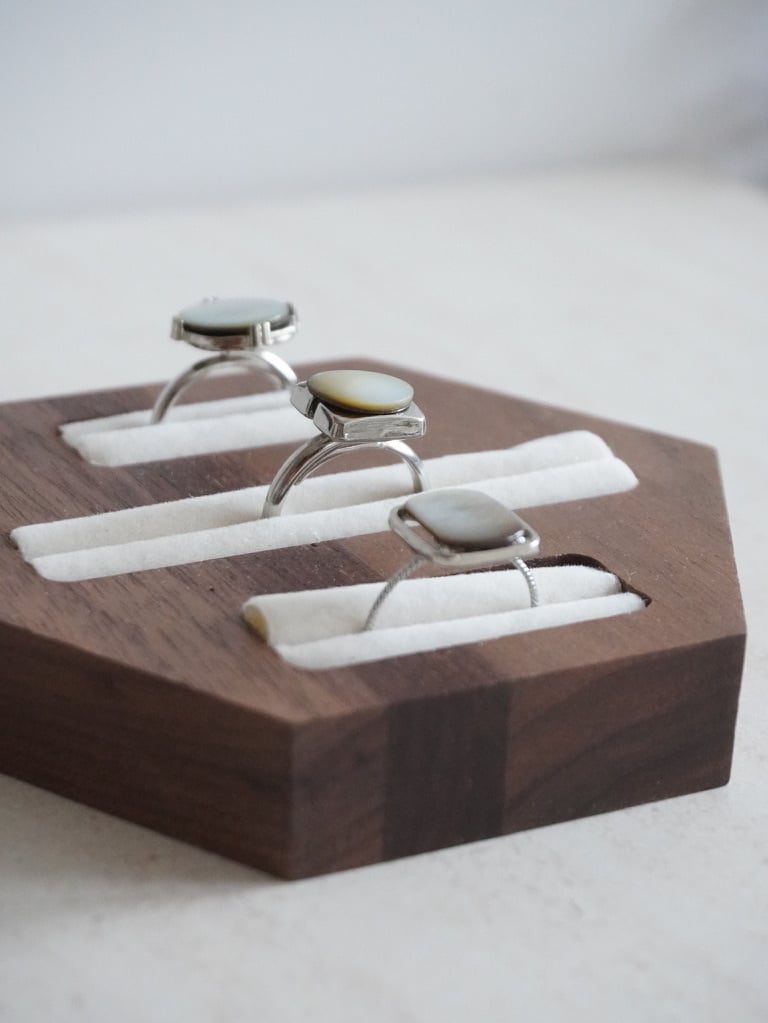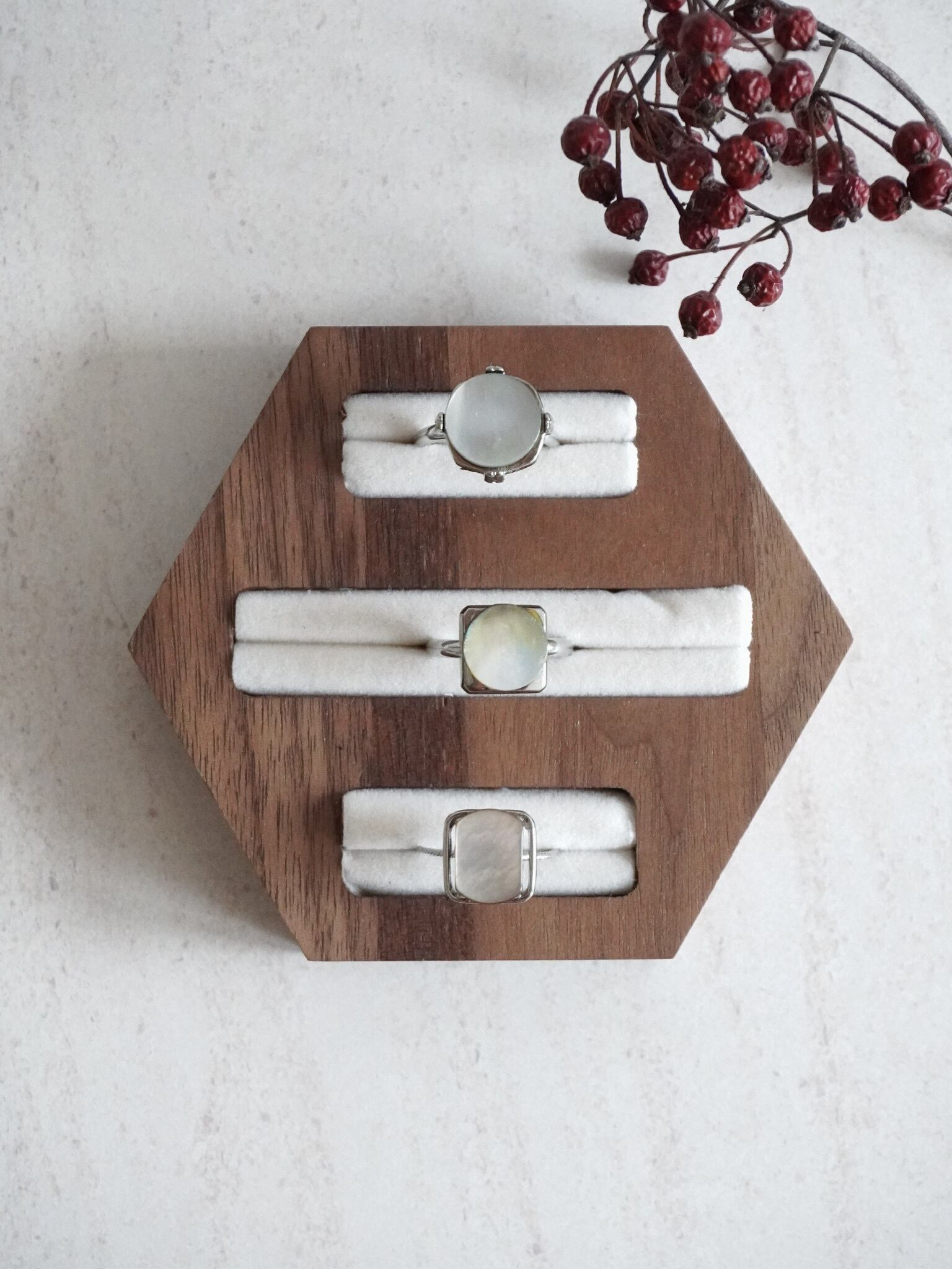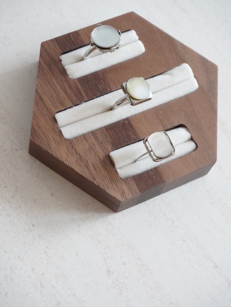 真ん中:厚みのある貝の丸と、メタルの四角が幾何学的なデザイン