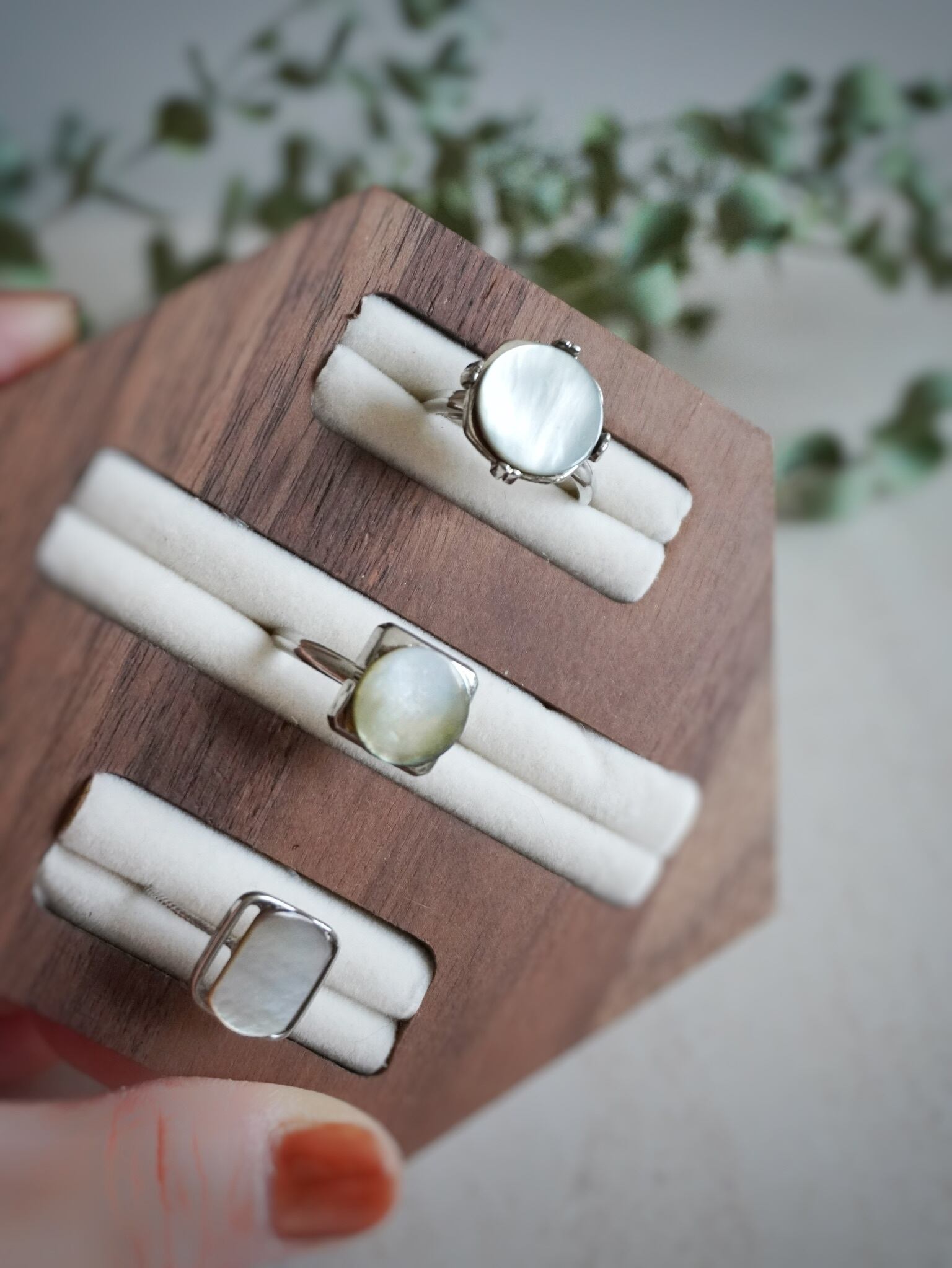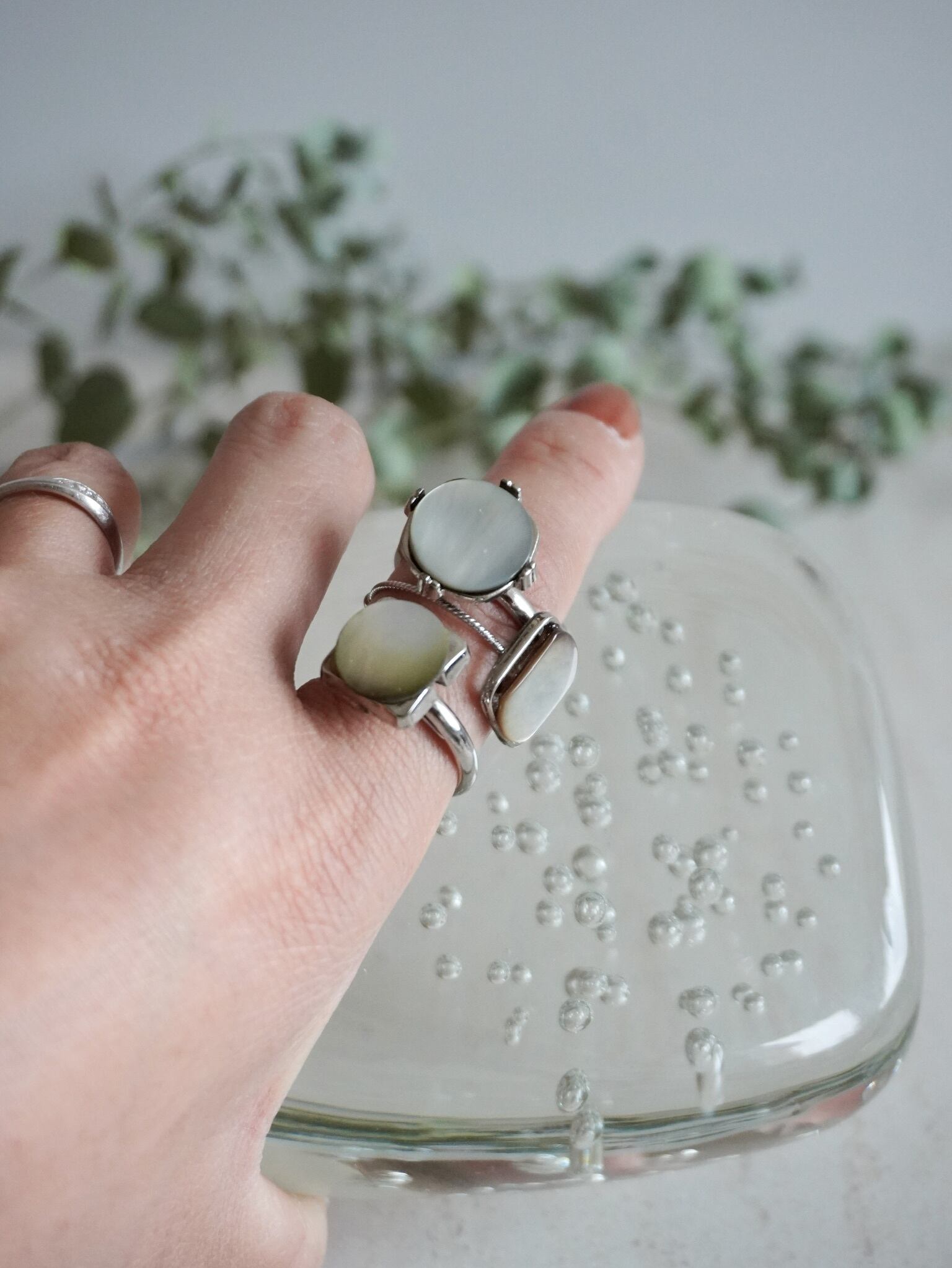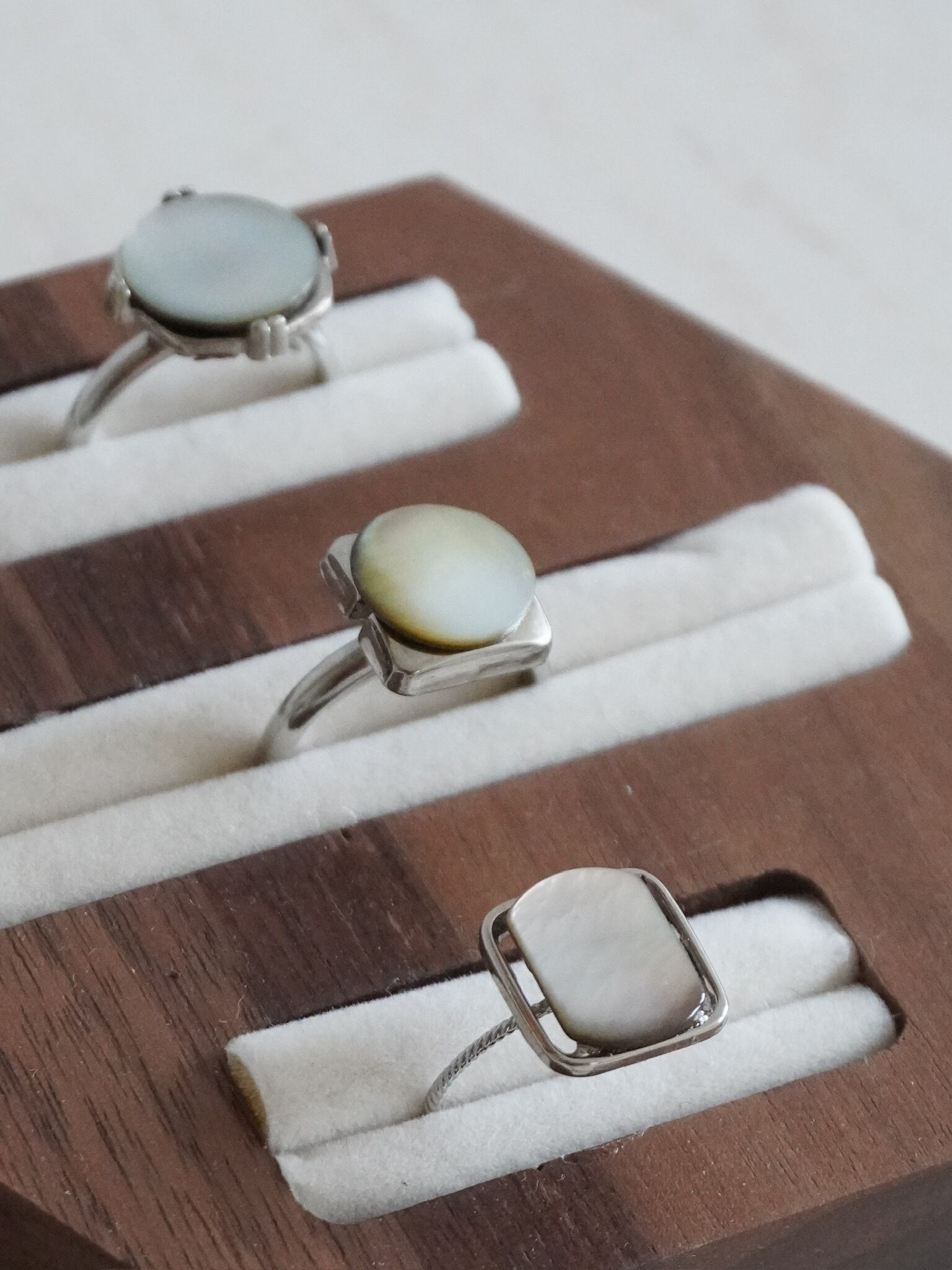 下:華奢なフレームと白蝶貝の組み合わせ。リング自体も細身デザインです