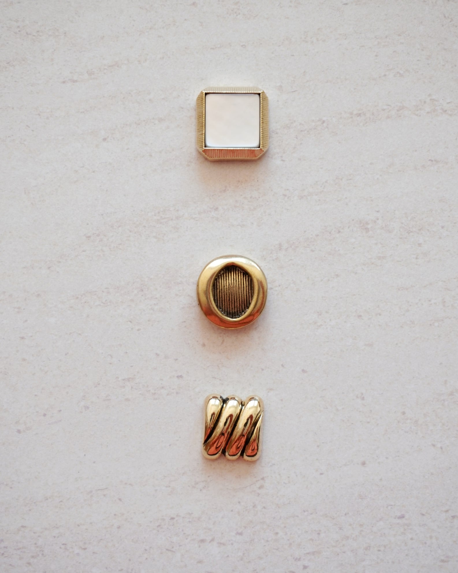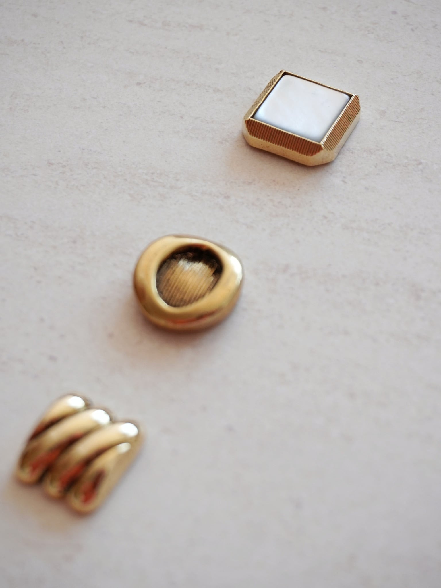 真ん中:コロンとしたフォルムと、渋めなゴールドがかわいい。ビンテージ感強めなボタン