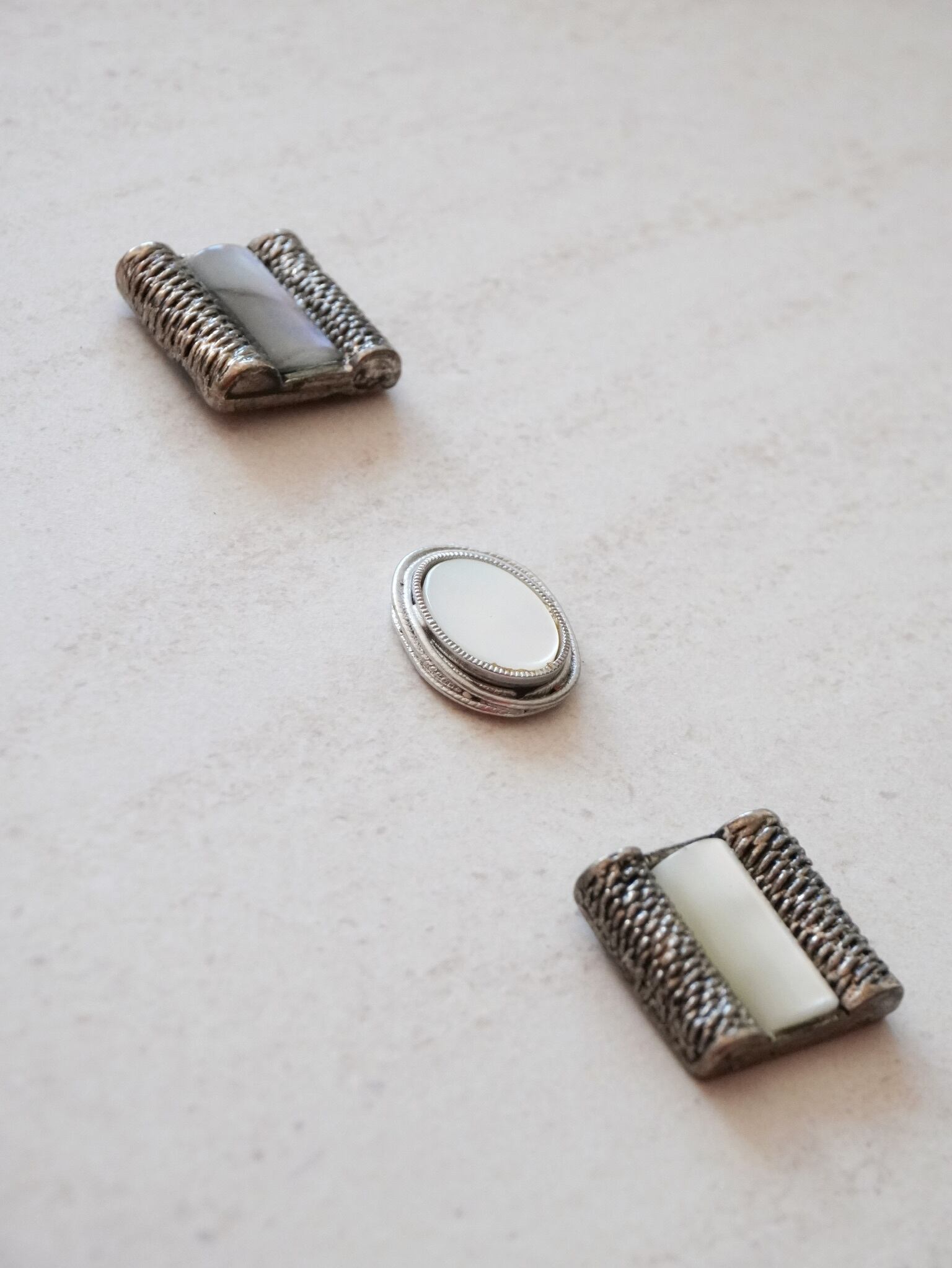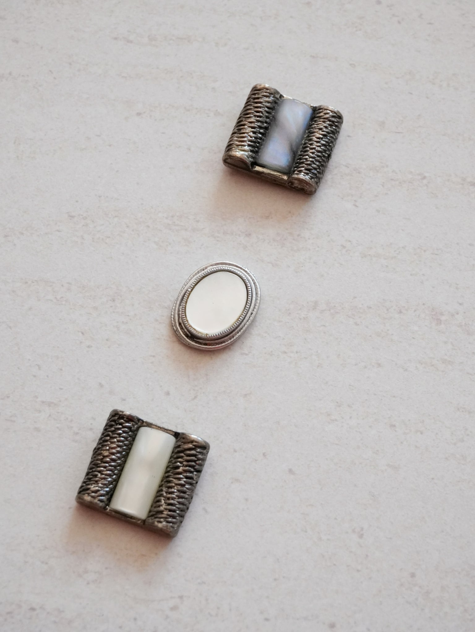 上・下:燻したようなシルバーでシェルのようなバーを挟むようにデザインされたボタン