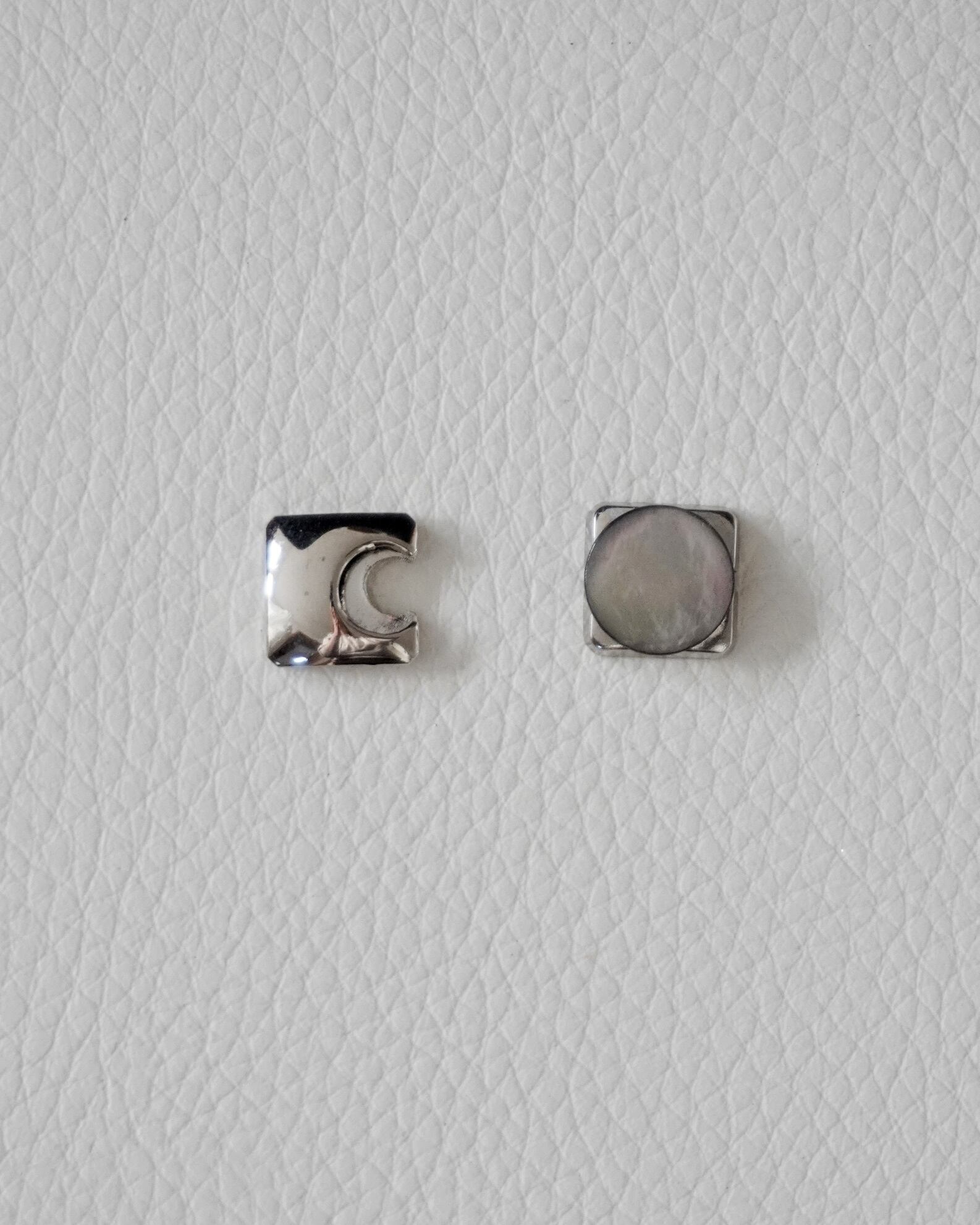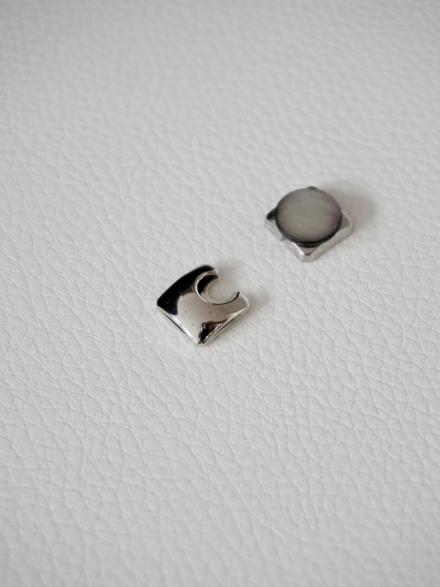 黒蝶貝のスクエアボタンと、パズルのピースのようなデザインのシルバーボタンの2点セットです