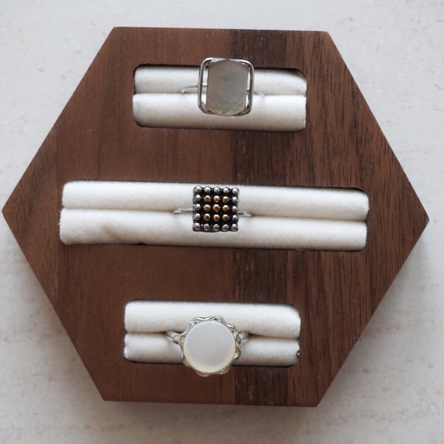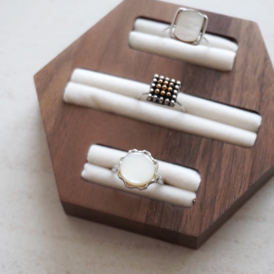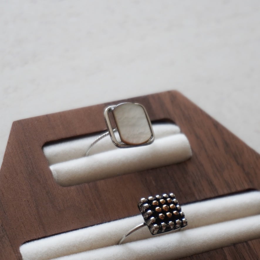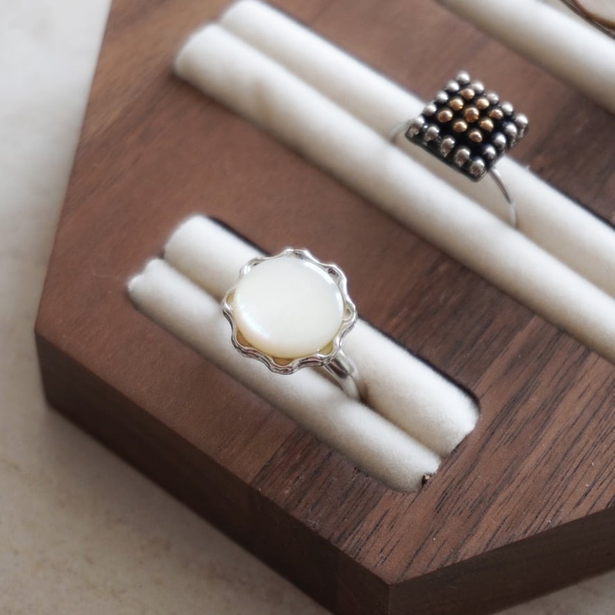 下:お花のようなシルバーのフレームに、白蝶貝が可愛いデザイン