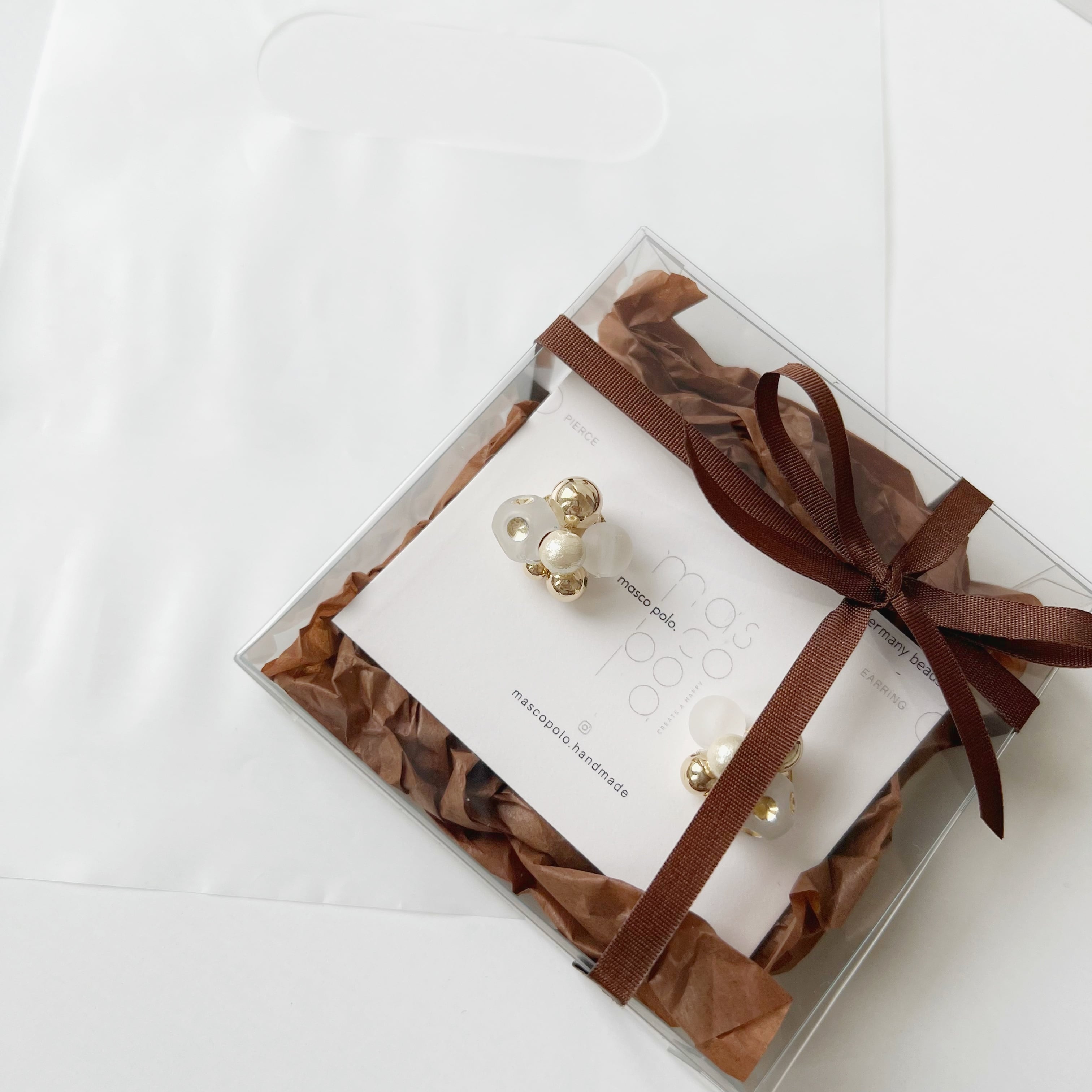 クリアBOXにリボンをかけ、お渡し用の袋をお付け致します