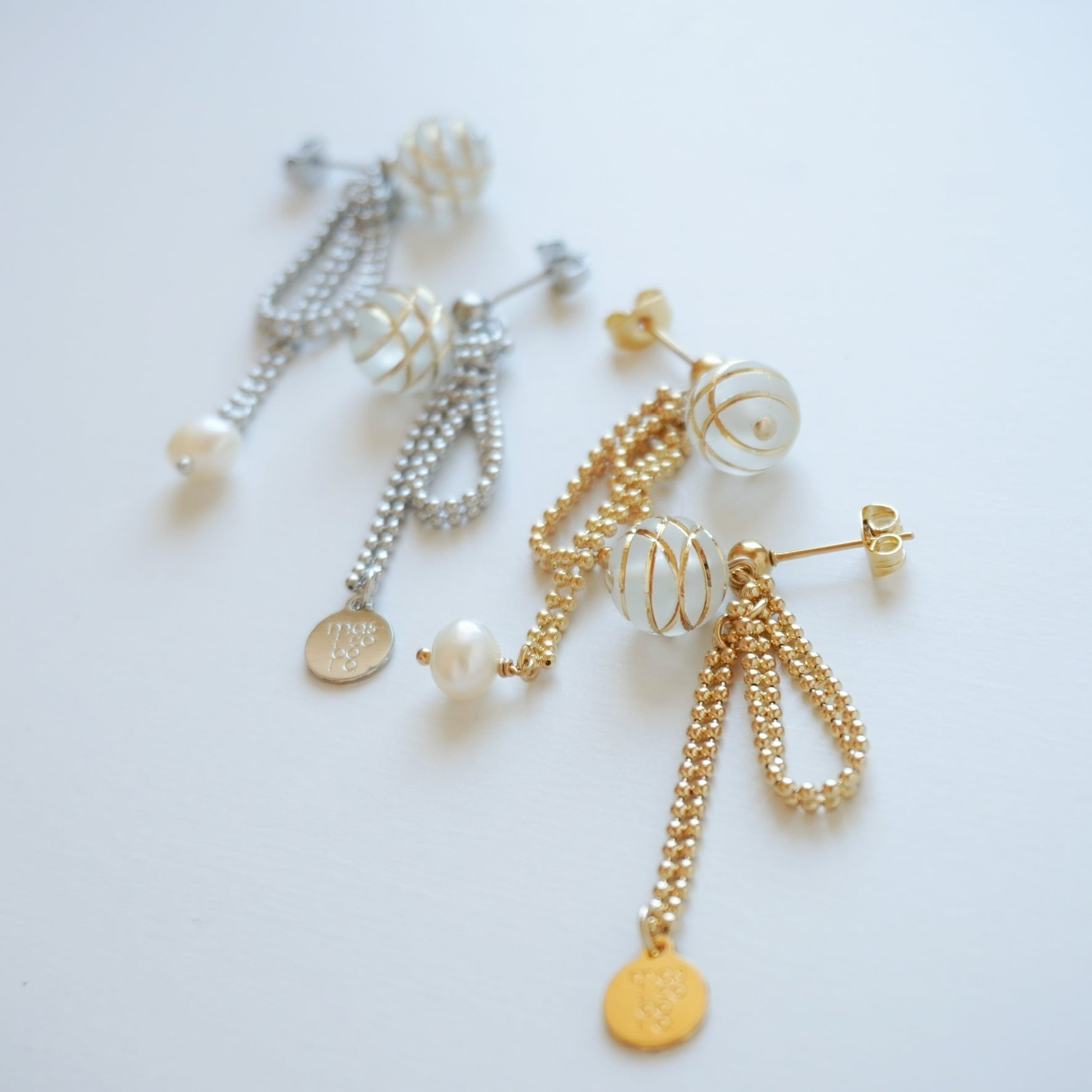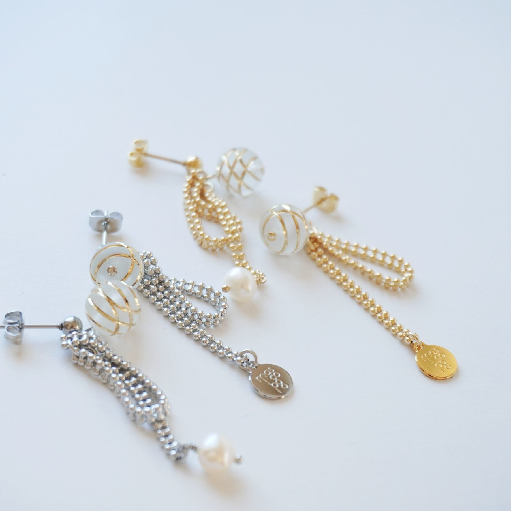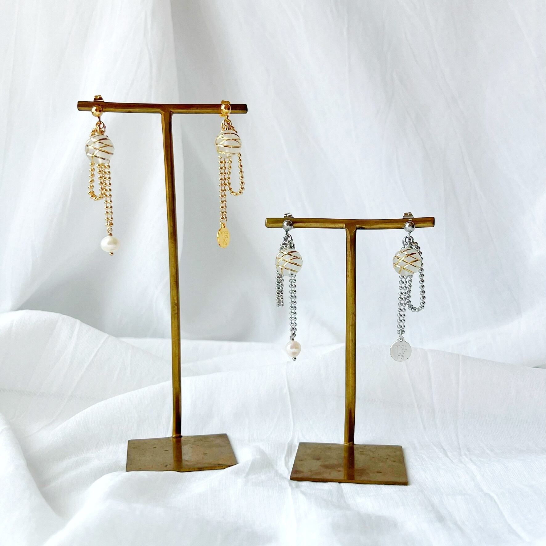 リボンの先には、淡水パールとロゴプレートが揺れます